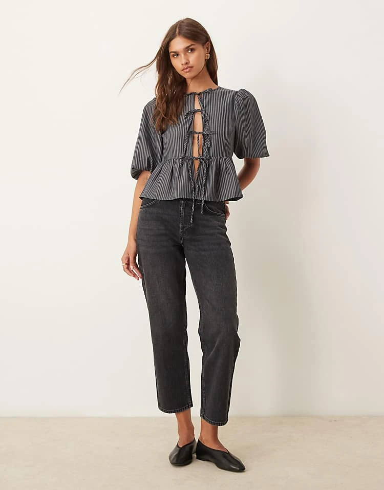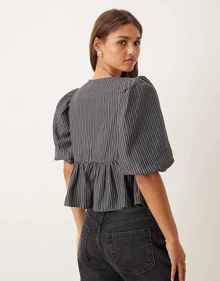 Glamorous Tie Front Volume Sleeve Shirred Maxi Dress In Grey And Black Stripe For Women Grey Black