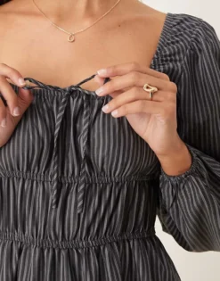 Glamorous Tie Front Volume Sleeve Shirred Maxi Dress In Grey And Black Stripe For Women Grey Black