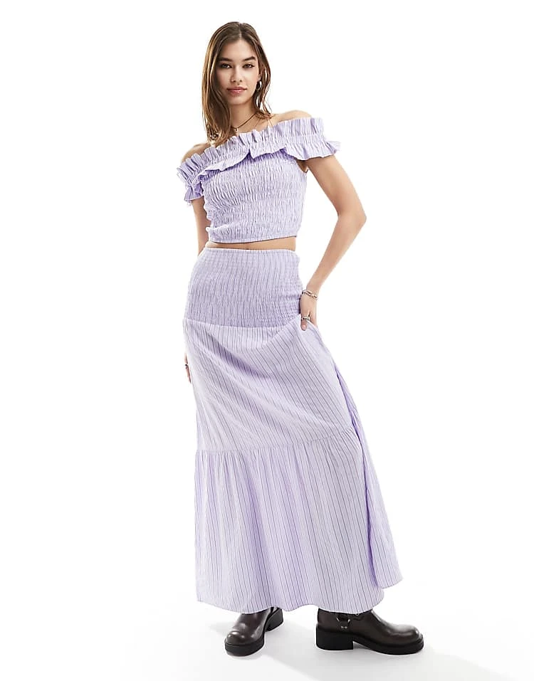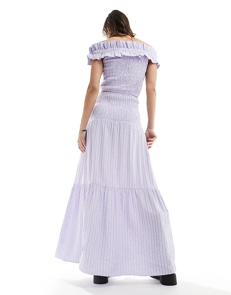 Glamorous Tie Front Volume Sleeve Shirred Maxi Dress In Grey And Black Stripe For Women Grey Black