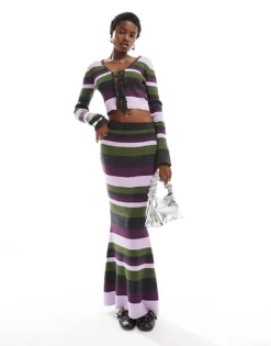 Glamorous Tie Front Fitted Cardigan In Purple Green Stripe Knit Co-ord For Women Green Purple Stripe