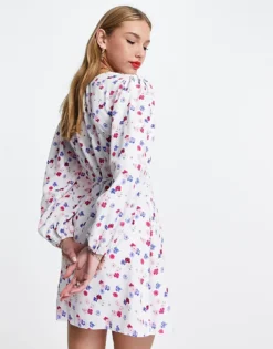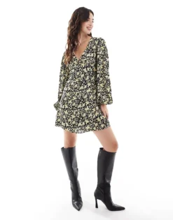 Glamorous Wrap Short Sleeve Tea Dress In Green Scribble Floral For Women Green White Scribble