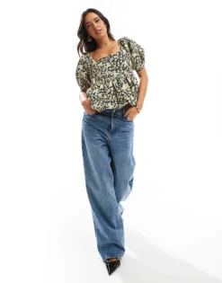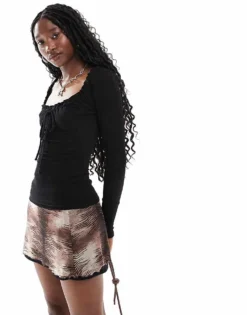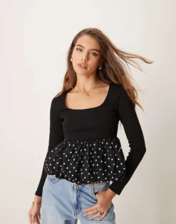 Glamorous Square Neck Long Sleeve Top With Puffball Hem In Black Polka Dot For Women Black/cream