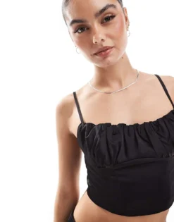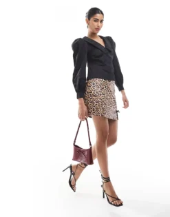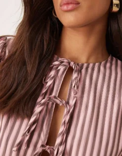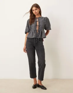Glamorous Poplin Tie Front Peplum Blouse With Puff Sleeves In Grey Black Stripe For Women Grey/black